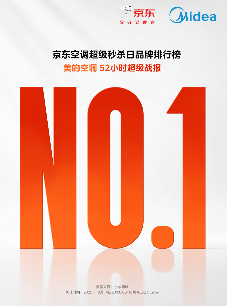 2025年双十一大促火热开启,美的系强势领跑空调行业:10月14日20点到10月16日24点,京东超级秒杀日52小时,美的空调登顶京东秒杀日家电品牌
