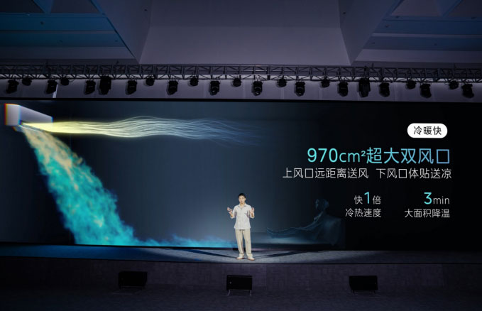 针对暖得慢的痛点,产品搭载970cm²超大双风口,出风面积是普通挂机的两倍,配合820m³/h澎湃大风量,实现全屋快速升降温。